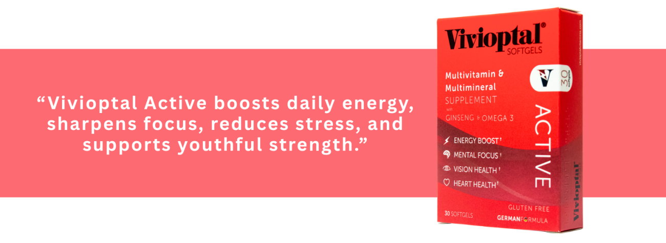 Formulated with a trusted German formula, Vivioptal Active is packed with a wide range of essential vitamins, minerals, omega-3 fatty acids, and ginseng. It’s not just a multivitamin—it’s a comprehensive solution for those looking to boost their energy, enhance mental and physical stamina, and reduce the effects of daily stress. Let’s explore how this unique blend can benefit you: