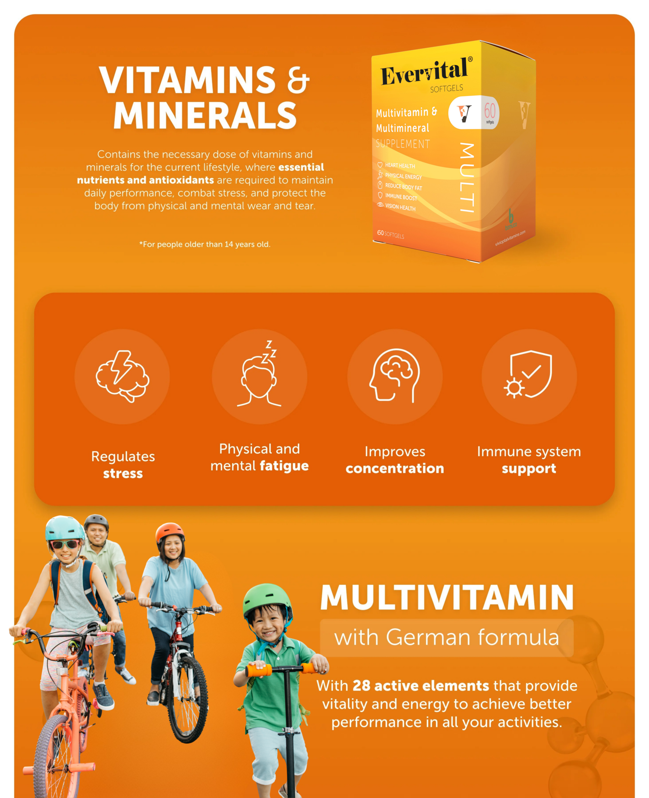 Evervital Multi is a unique multivitamin and multimineral formula providing 28 essential vitamins, minerals and bioactive nutrients to restore daily energy and vitality. It helps improve stamina, support immunity and maintain healthy heart, brain and muscle function. Regular use also supports metabolism and overall performance, helping the body stay active and balanced throughout the day.