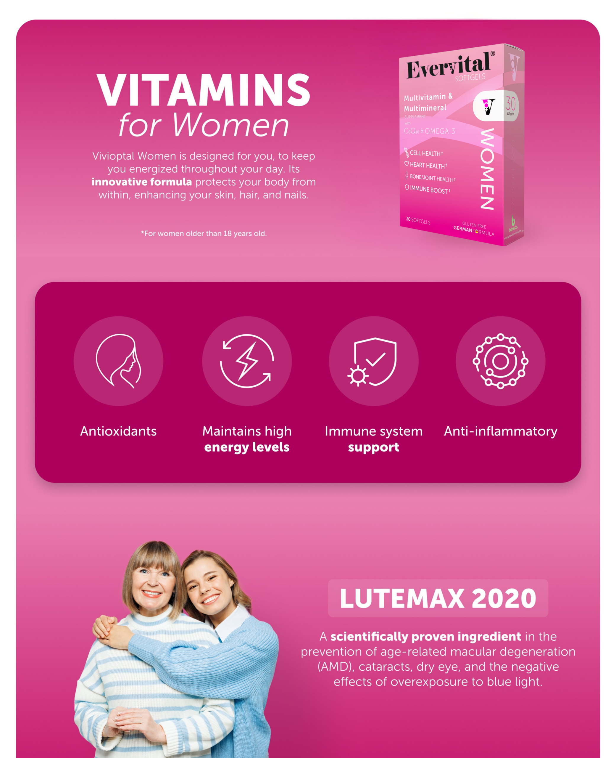 EVERVITAL WOMEN CONTAINS A WIDE RANGE OF VITAMINS, MINERALS AND SPECIAL INGREDIENTS TO SUPPORT WOMEN’S HEALTH.