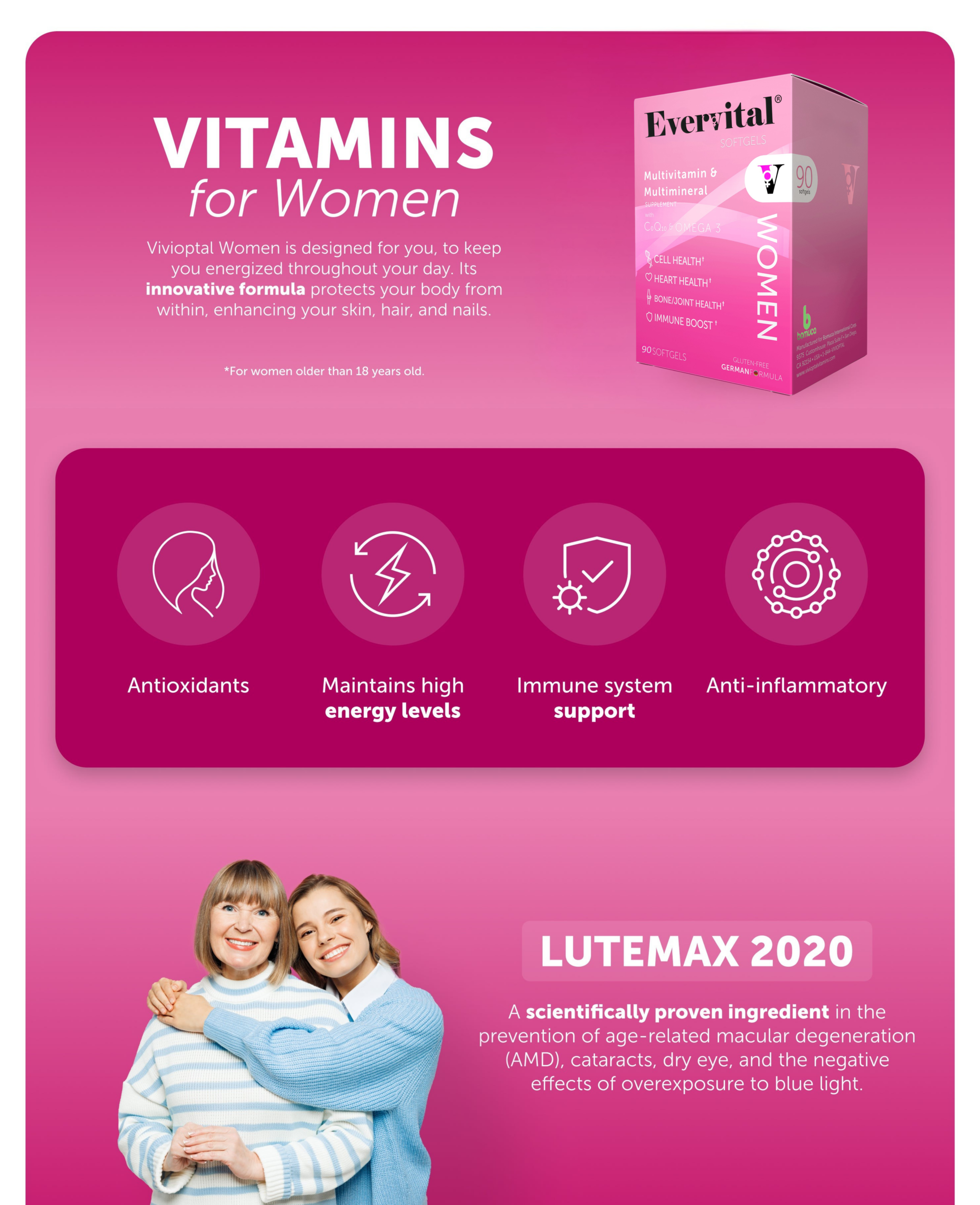 EVERVITAL WOMEN CONTAINS A WIDE RANGE OF VITAMINS, MINERALS AND SPECIAL INGREDIENTS TO SUPPORT WOMEN’S HEALTH.